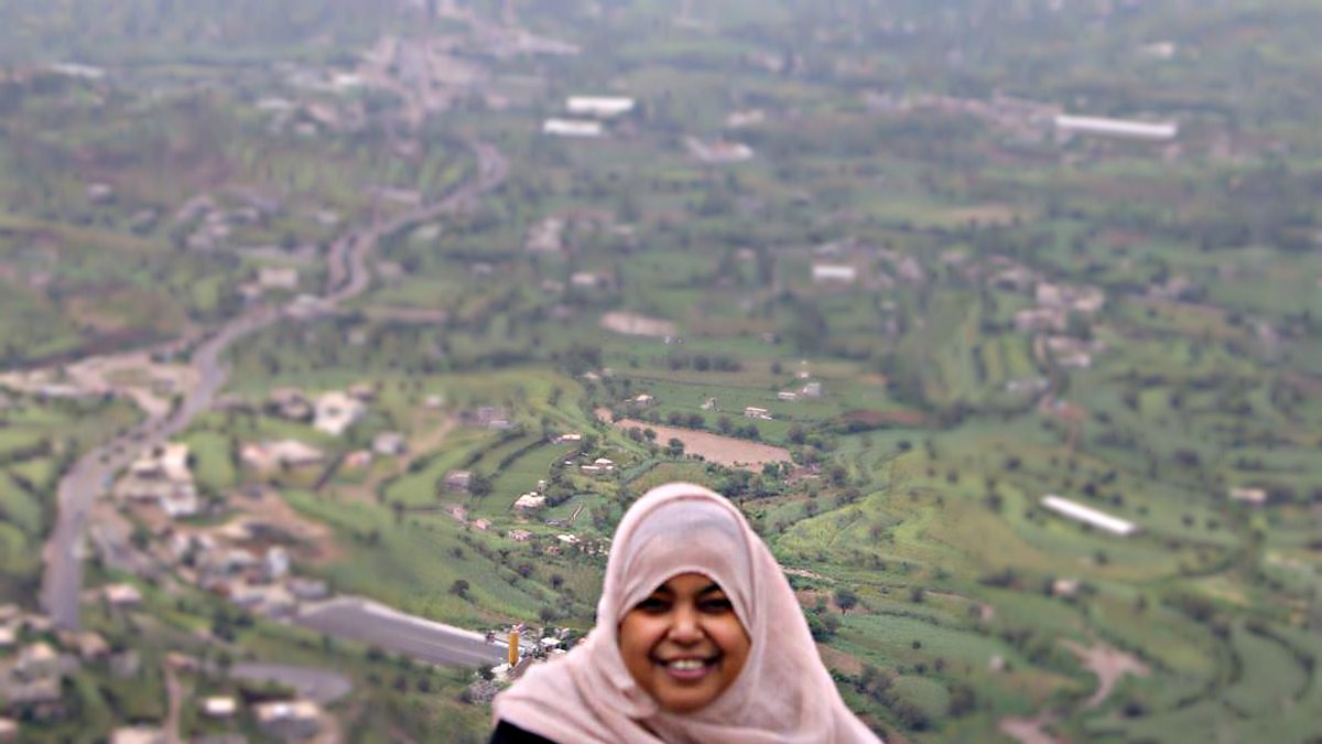 (Image: Mona Mohammed al Khattib with mountain backdrop. Courtesy of Mohammed Al Khattib)