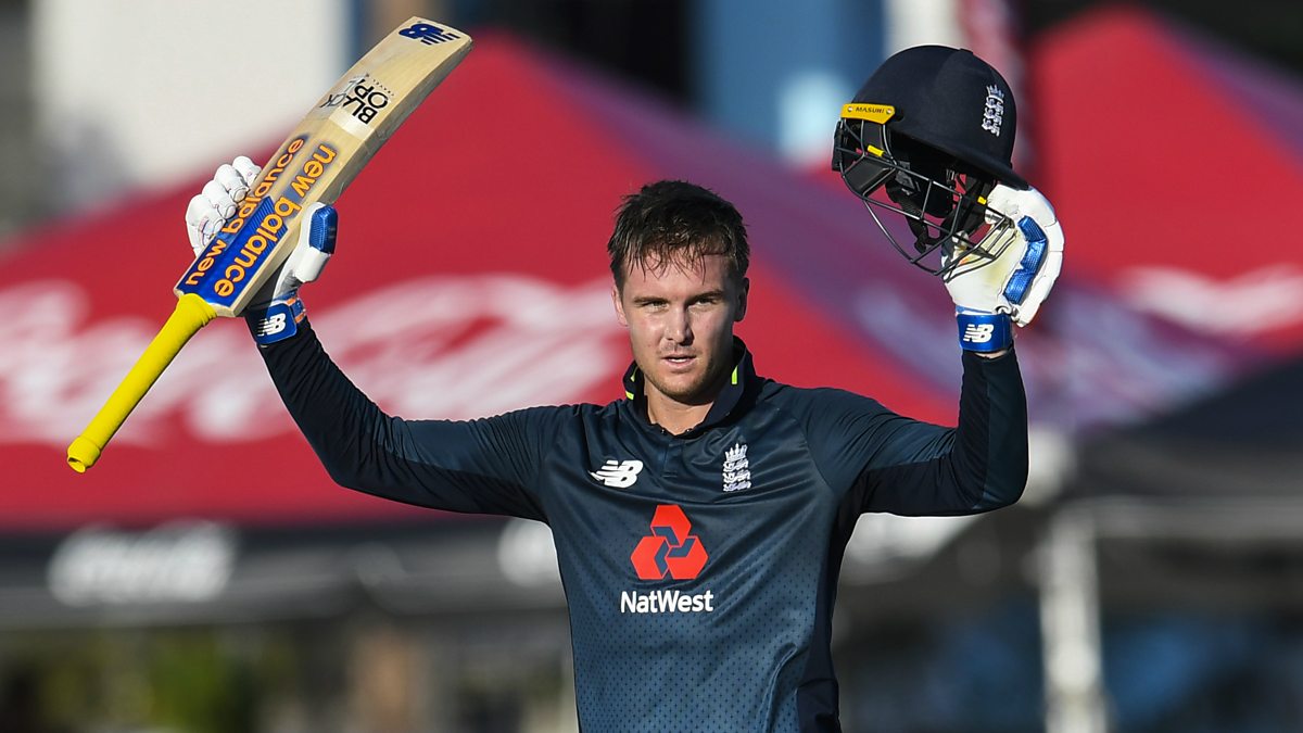 Photo: Jason Roy celebrating his century during the 1st ODI between West Indies and England (Getty Images)