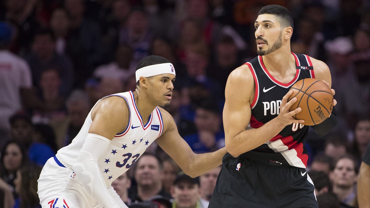 (Tobias Harris #33 of the Philadelphia 76ers guards Enes Kanter #00 of the Portland Trail Blazers in the fourth quarter at the Wells Fargo Center. Credit: Mitchell Leff/Getty Images)