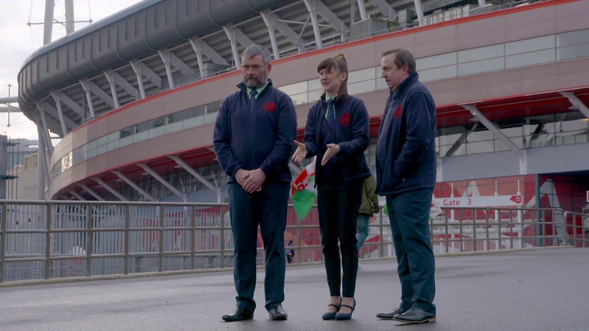 Things get slightly heated as Gwilym vents his frustration to Amy and Mark about the three feathers emblem at the Wales v South Africa rugby game.