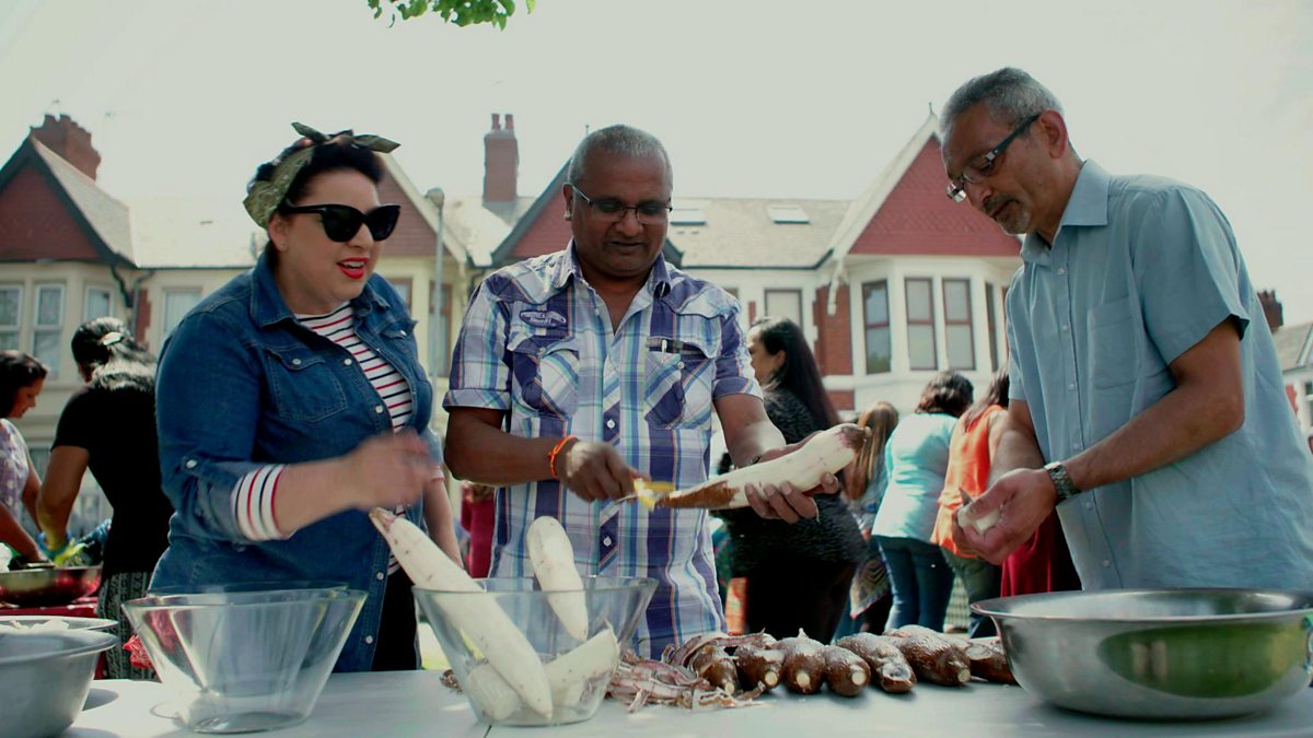 Sam and Shauna prepare a huge Indian vegetarian feast with three hundred members of Cardiff's Gujarati community, including their unique take on the classic burger and chips.