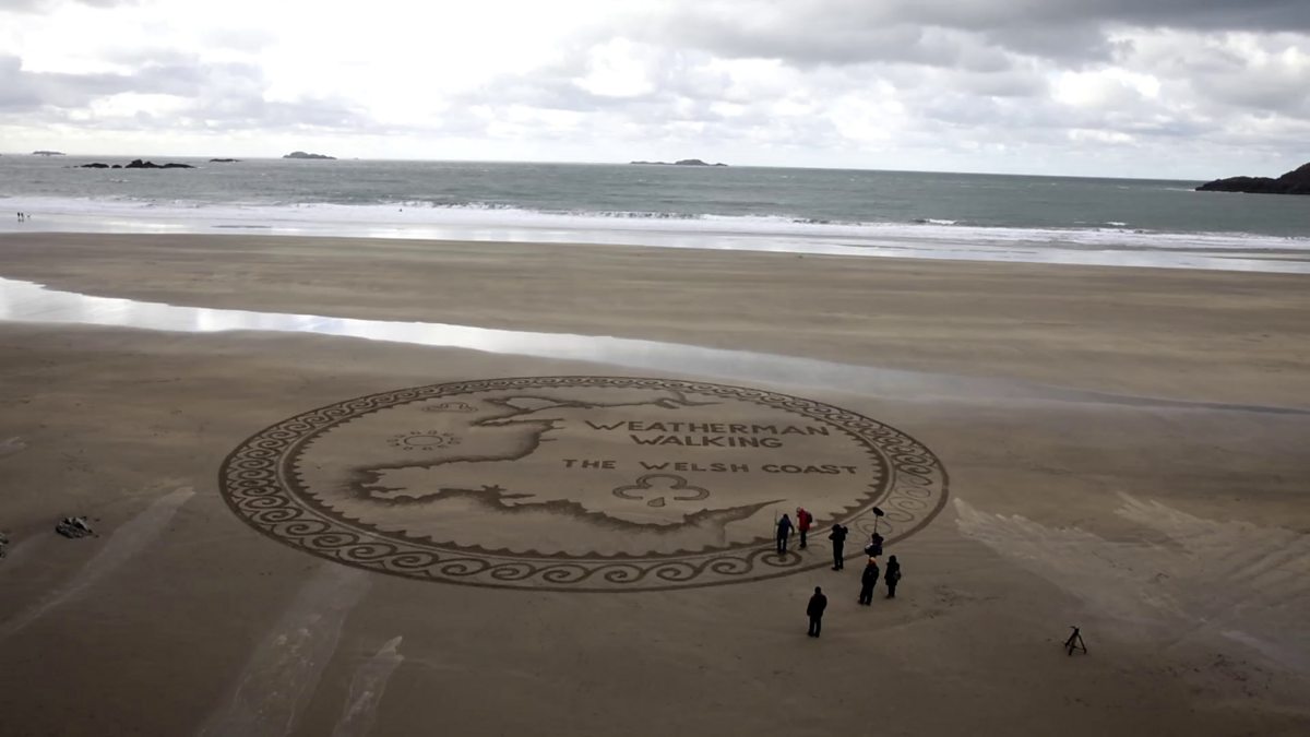 Sand circle artist Mark Treanor creates a special work for Weatherman Walking the Welsh Coast on the beach at Whitesands, Pembrokeshire.