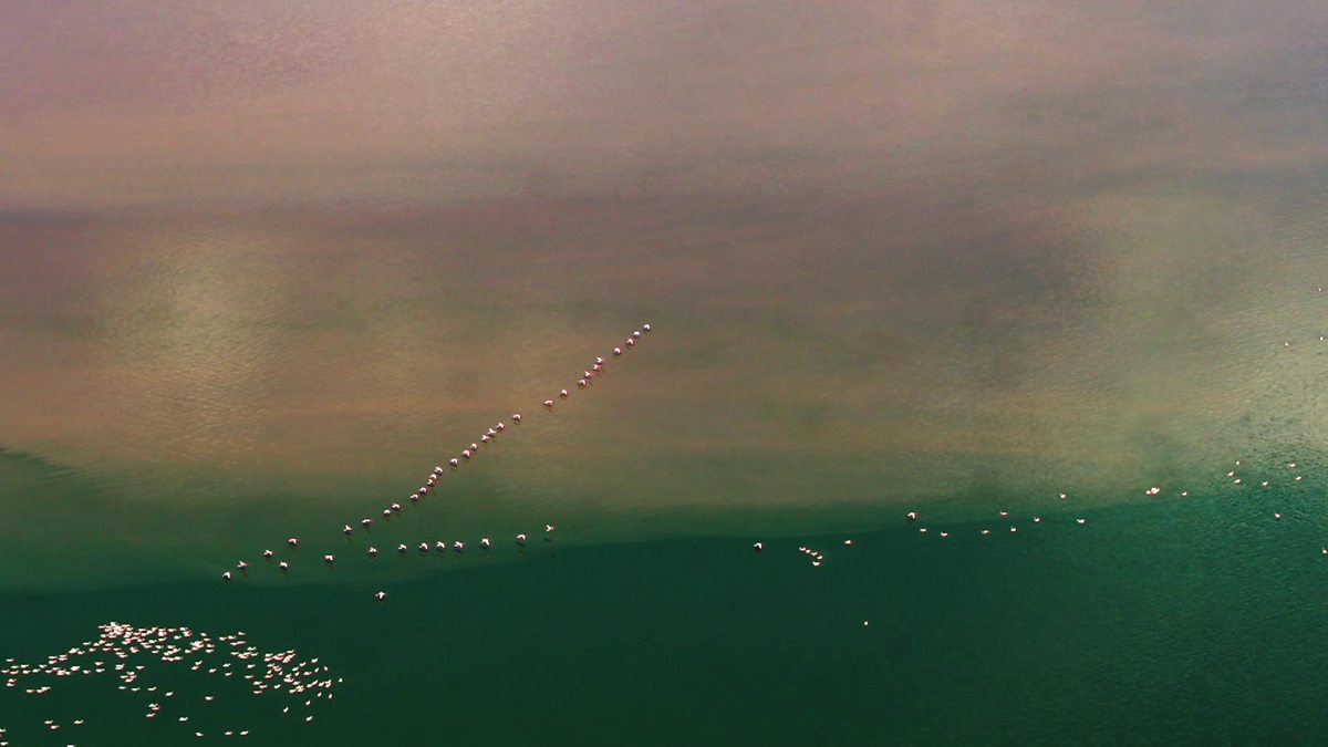 Gordon Buchanan flies over Lake Bogoria in Kenya with helicopter pilot Hamish Rendall to witness a natural spectacle; an immense gathering of lesser flamingos.