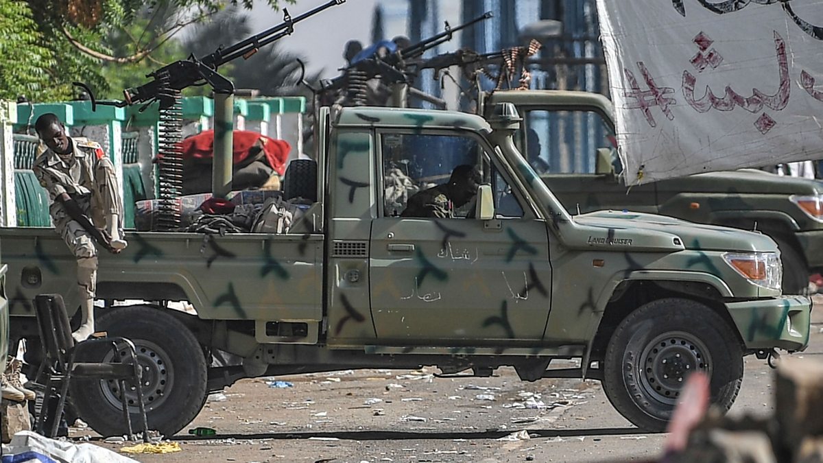 (Picture: Sudanese millitary vehicles and soldiers outside the army headquarters in the capital Khartoum Credit: Ozan Koze/AFP/Getty Images)