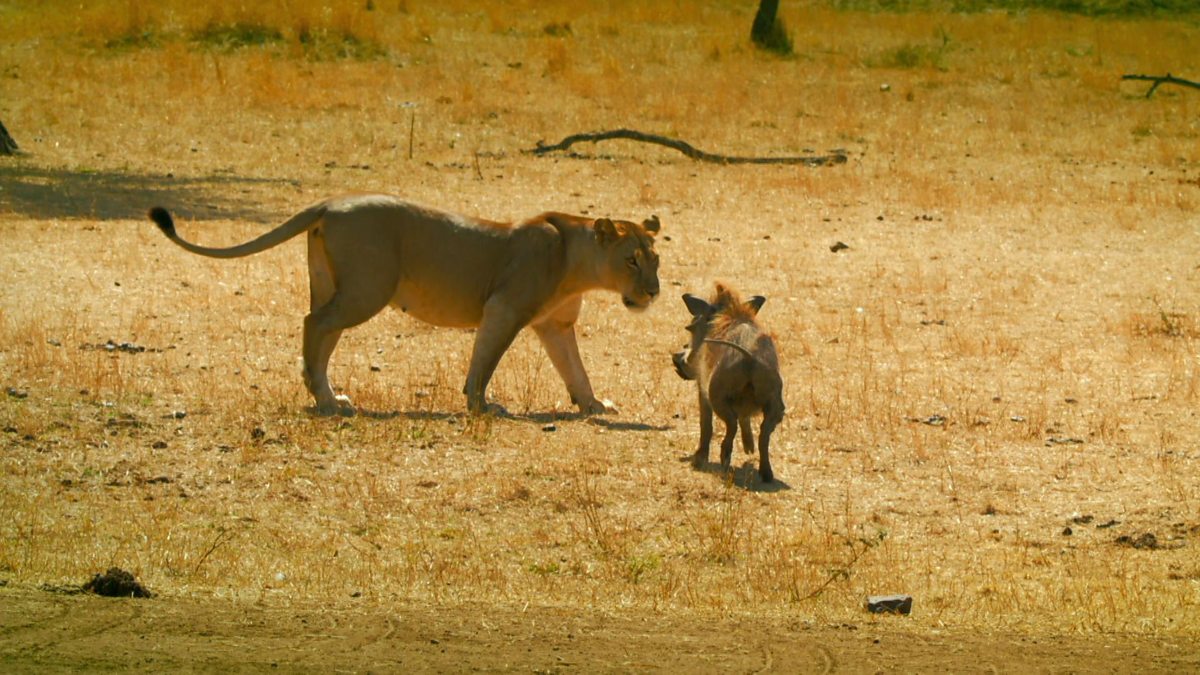 Kali, the lioness, gets a surprise from a warthog