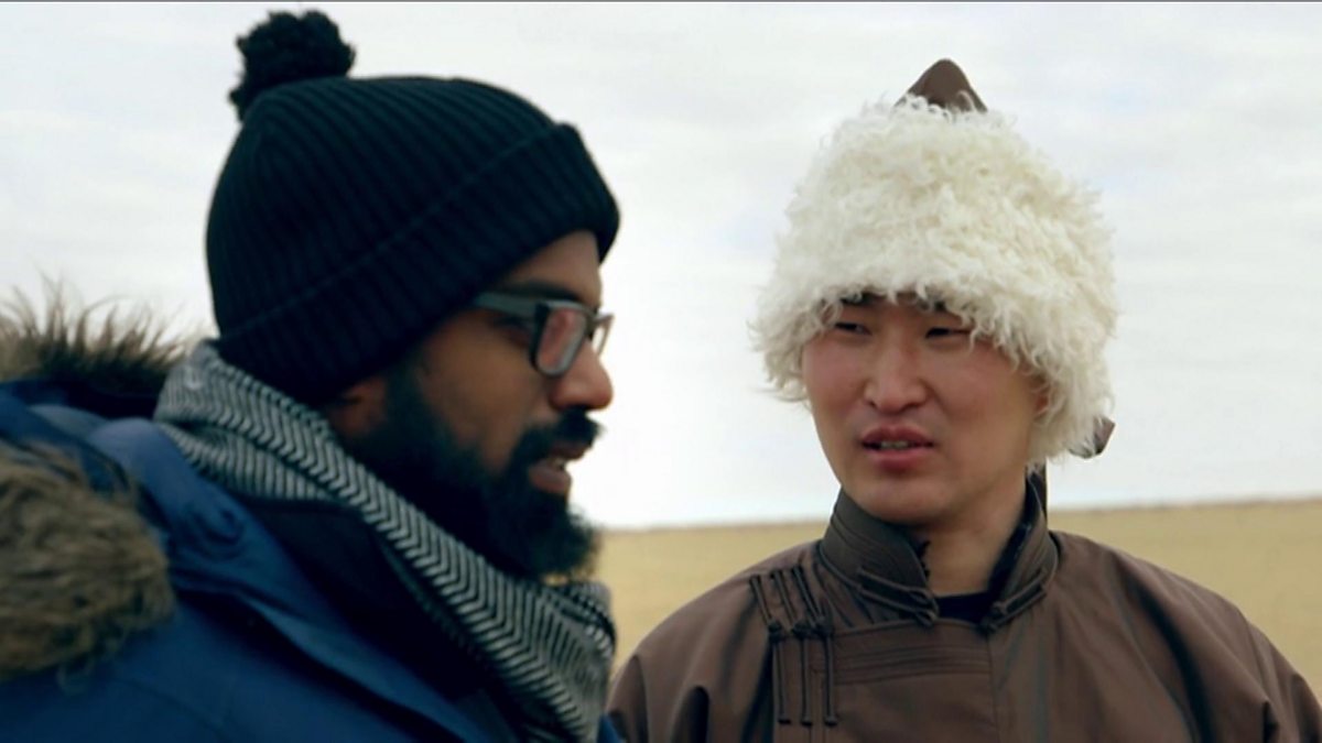 In Mongolia's Gobi desert, Romesh explains to guide Ider why he can't travel by camel.