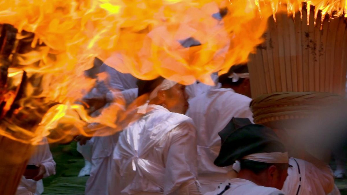 Shinto devotees carry enormous 50 Kg flaming torches up and down the steep stairs leading to sacred Nachi Falls in Japan, to purify the route so that deities can visit the falls.