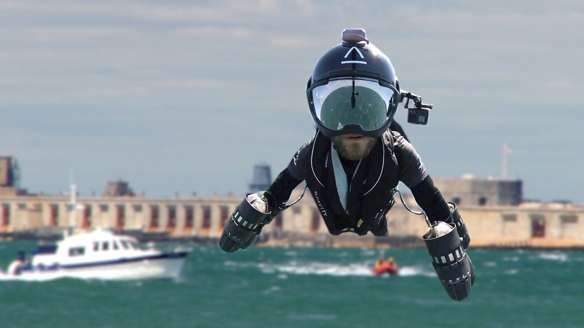 Richard Browning delivering a letter to the Isle of Wight in a jet suit.