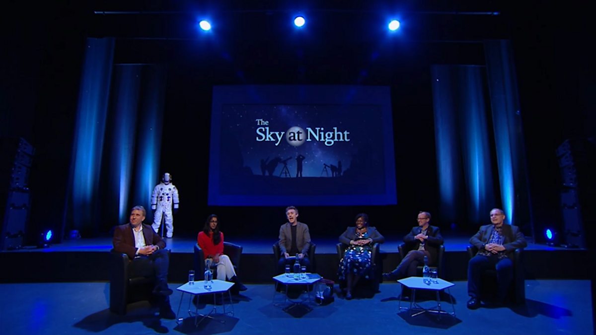Presenter, Dallas Campbell presents the Sky at Night Question Time Panel: Chris Lintott, Maggie Aderin-Pocock, Pete Lawrence, Farzana Meru and Leigh Fletcher.