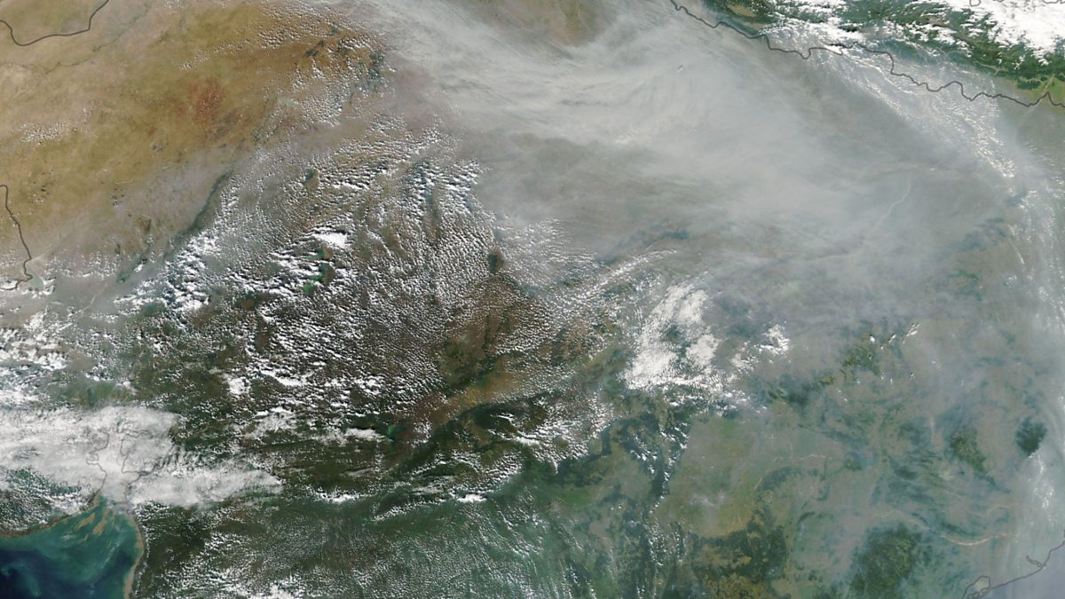(Photo: A satellite image of a plume of smoke sweeping through Delhi and Kanpur, India on 4 November. Credit: EPA/NASA Earth Observatory)