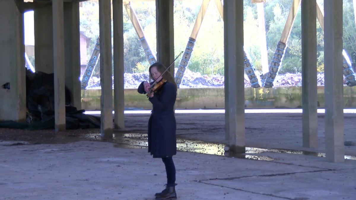 Violinist Zoë Beyers performed in a cooling tower at Ironbridge Power Station.