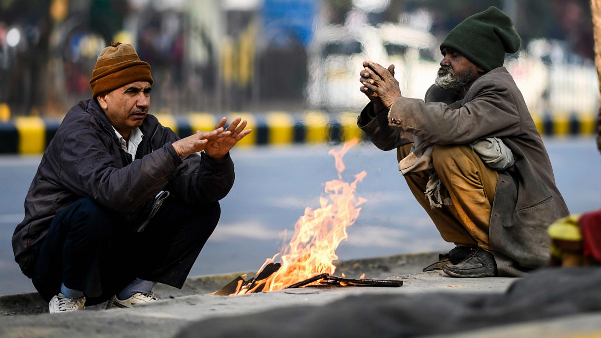 (Picture: Men warming themselves at a small fire in cold Delhi.