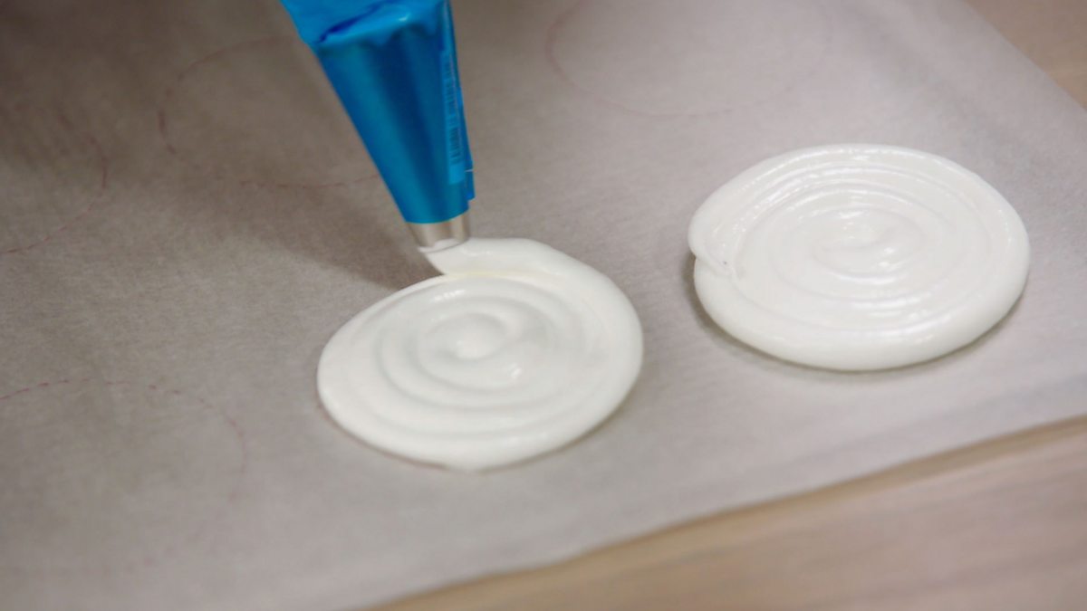The meringue challenge is underway. The cooks whip and pipe their meringues, as the judges discuss whose looks good... and whose doesn't.