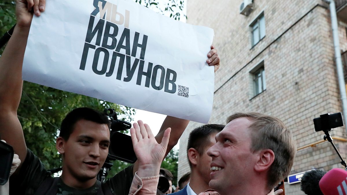 (Picture: Russian journalist Ivan Golunev (R) and supporters after his release from arrest.