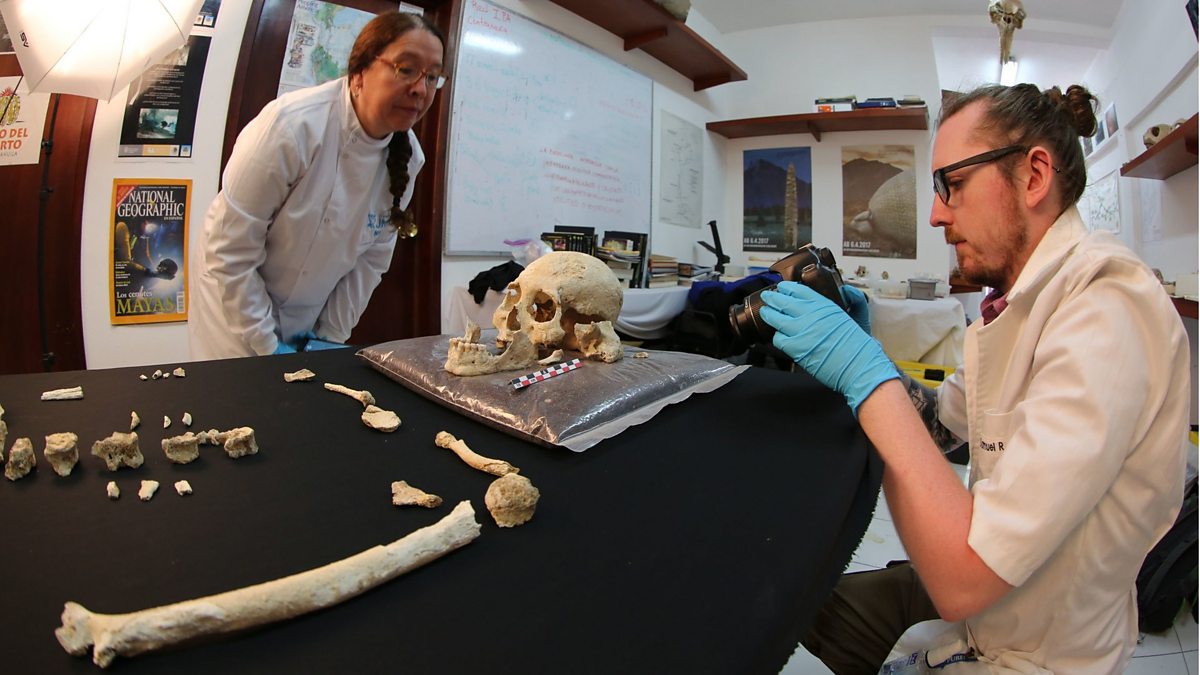 (Photo: Prof Silvia Gonzalez (L) and Dr Sam Rennie (R) examine the Chan Hol 3 skull. Credit: Jeronimo Aviles Olgui/Plos One/PA Wire)