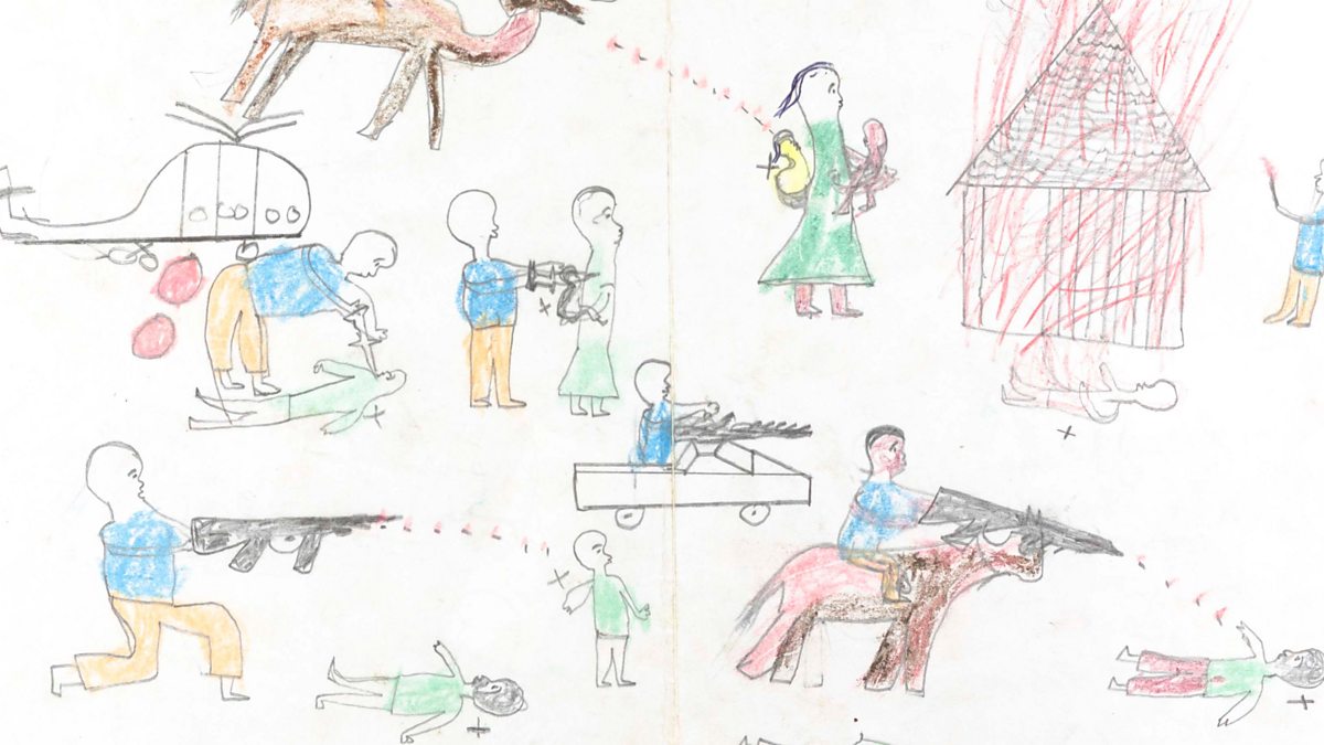 Their brutality was witnessed and captured in the drawings of children who survived these attacks. The drawings are now on display at the Wiener Holocaust Library in London.