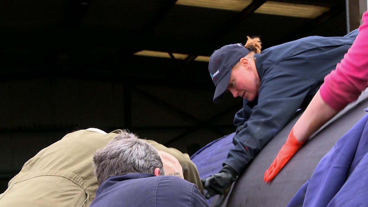 The Row the Erne team are finishing off their currach. It's a team effort to put a 30 foot skin on their boat.
