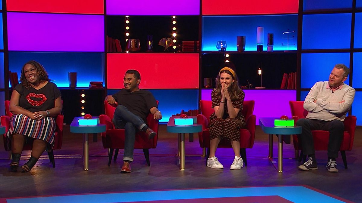 Ellie Taylor is trying her hardest to spell ‘psycho’. Poor Ellie says she usually employs spell check. Never mind that, we’re more interested what forms Miles Jupp has to fill in?!
