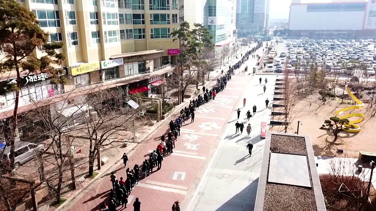 A drone has captured footage of hundreds of South Koreans queuing for masks in Daegu, one of the centres of the coronavirus outbreak in the country.