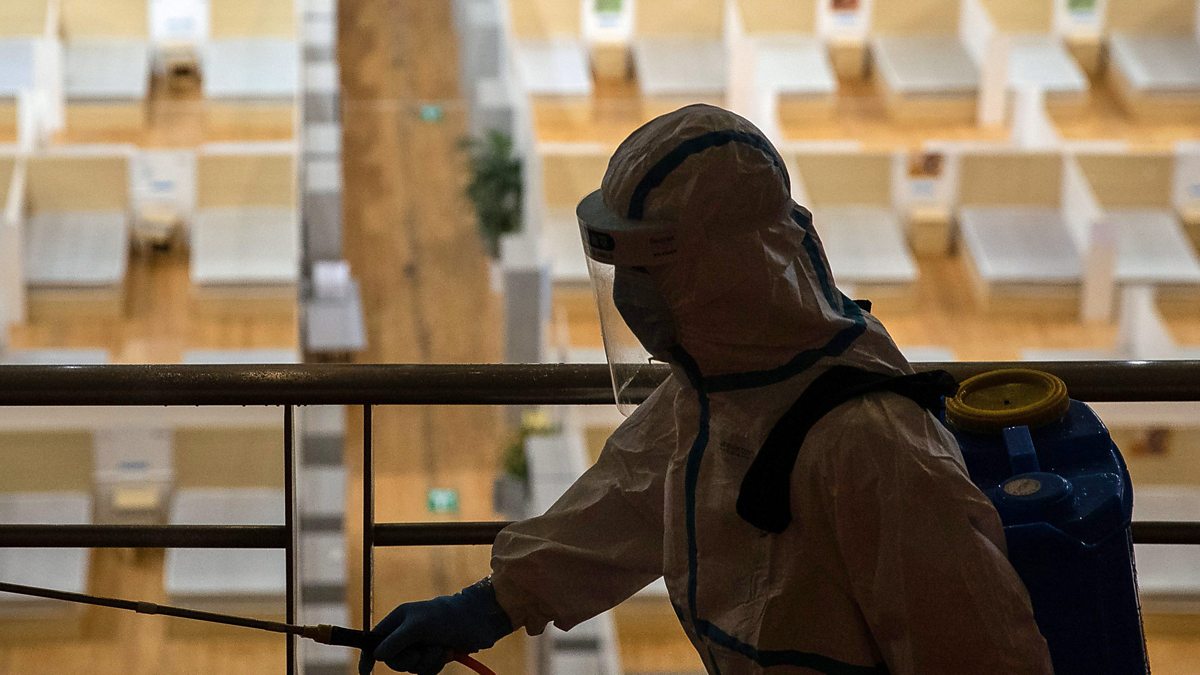 Photo: A worker sprays down a new hospital, Wuhan district Credit: Getty Images
