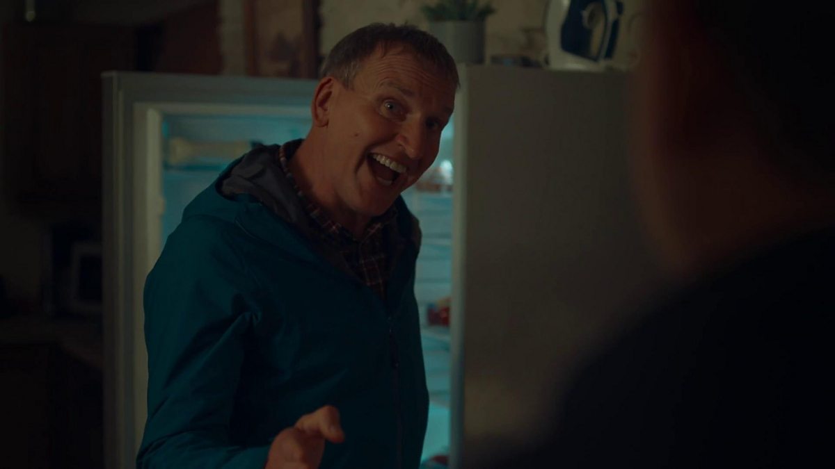 Maurice is not happy this his scotch egg is no longer in the fridge. Eddie enters and asks his dad if he's alright. Maurice is clearly angry.