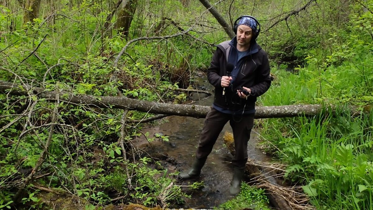 (Photo: BBC Russian’s Oleg Boldyrev recording in the forest, Credit: BBC, Oleg Boldyrev