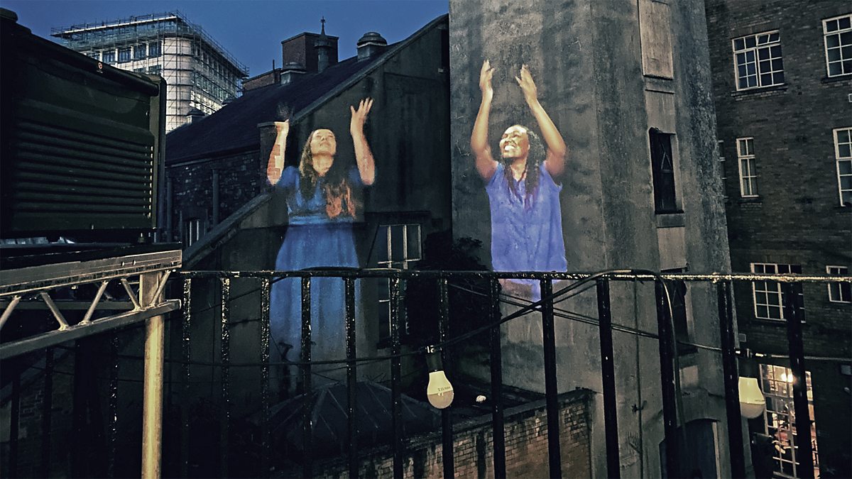 The performers were recorded in a socially distanced film shoot in a green screen studio. Projection specialist Jon Street collaborated with Cathy to edit the footage with 3D Projection Mapping software and visual effects. Finally, the footage was projected on to buildings at Bridewell Island in Bristol over the course of one night.