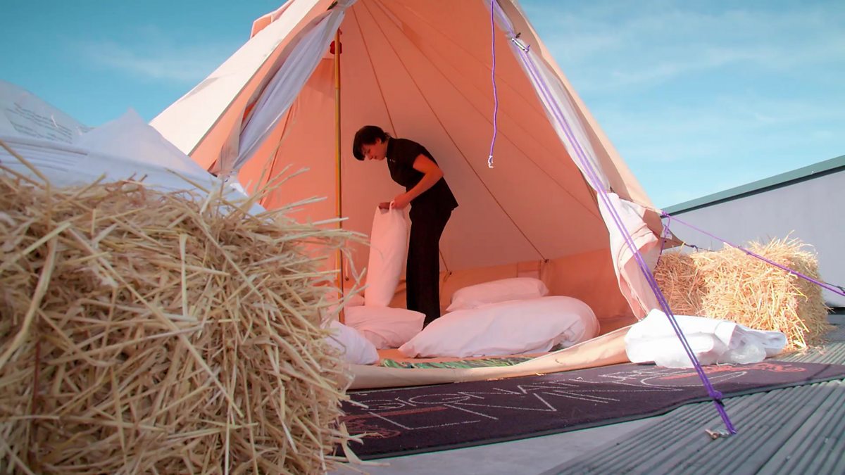 The team pitch tents on the hotel's roof in an attempt to create a glamping festival feel.