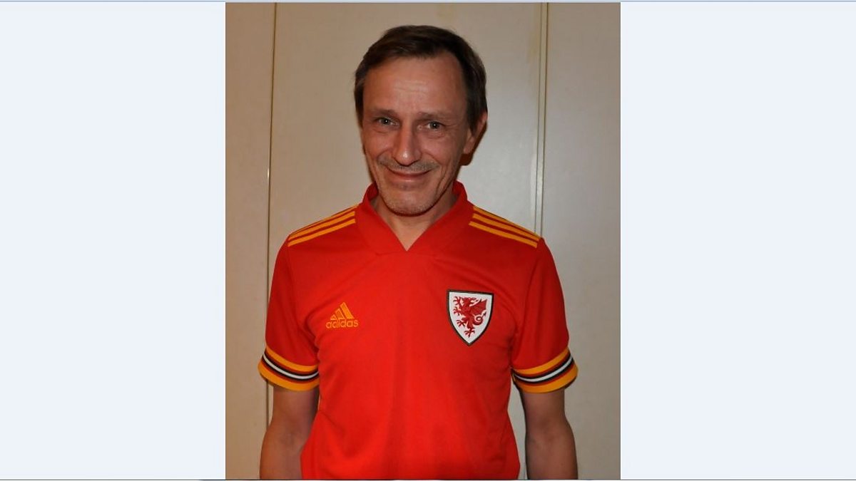 Klaus Neuhaus o Düsseldorf sy'n dysgu Cymraeg er mwyn dilyn tîm Cymru ar deithiau tramor.