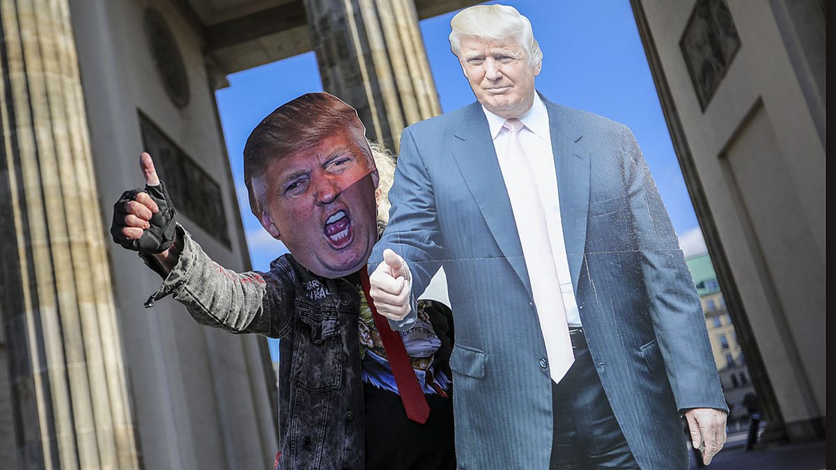 (Photo: A person wearing mask with the images of US President Donald Trump stands in front of the Brandenburg Gate near the US Embassy in Berlin. Credit: Getty)