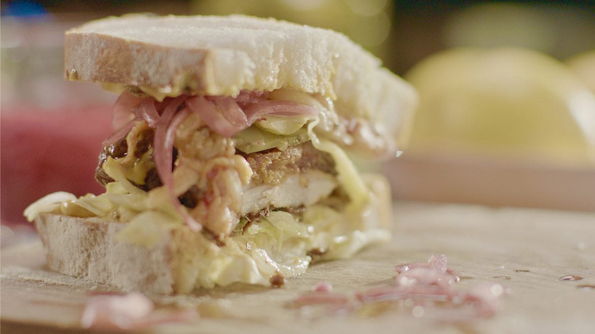 Nigella gets to grips with her fried chicken sandwich with pink pickled onions. It sounds and looks delicious.
