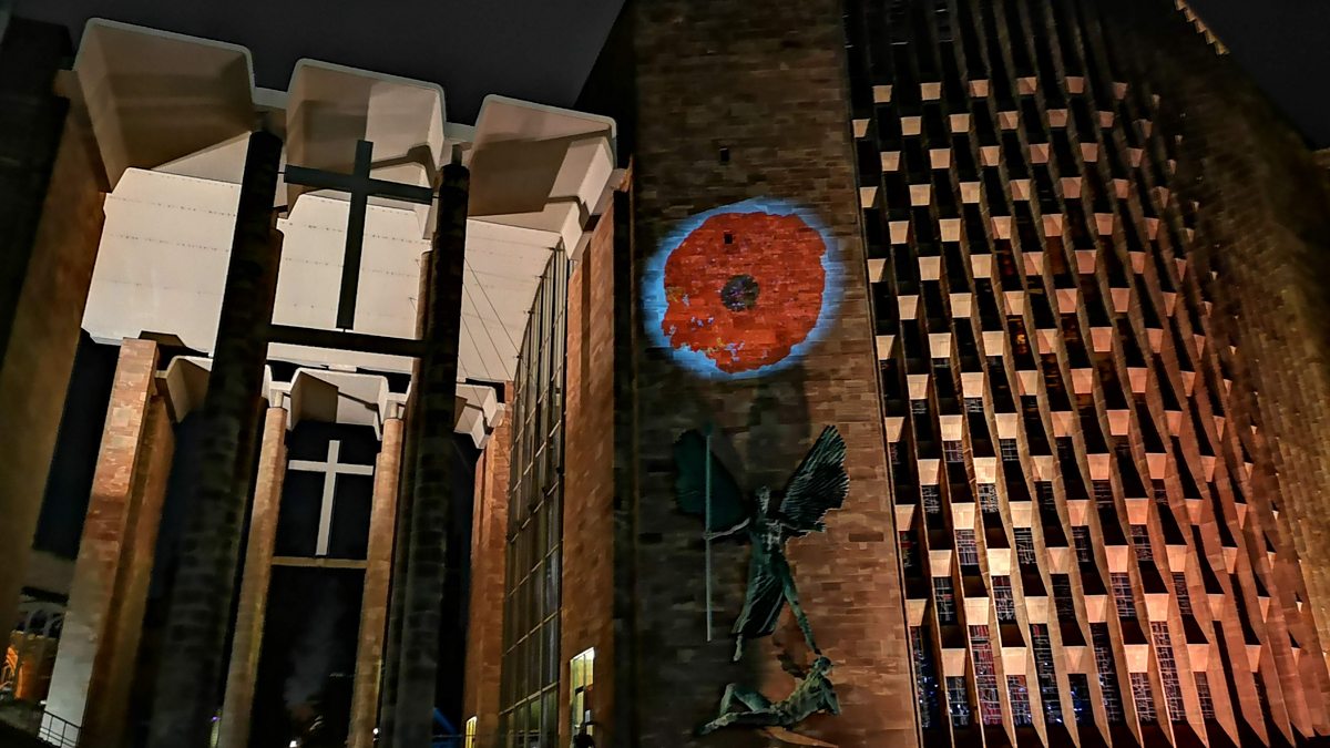 A giant poppy mosaic has been created with photographs submitted from across England to mark this year’s Armistice Day. The image has been projected on landmarks across Coventry.