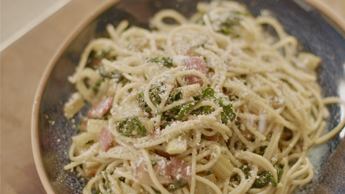 Nigella serves up spaghetti with rainbow chard and anchovies, topped off with grated parmigiano.