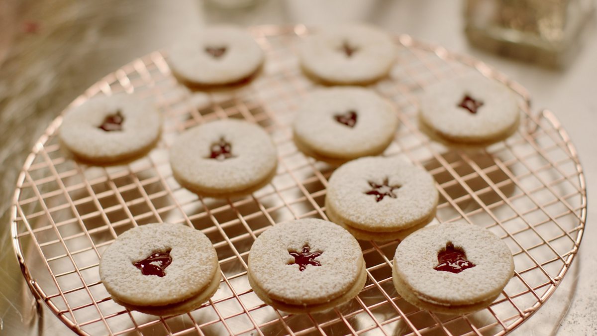 Nigella completes her linzer cookies by filling with jam and sprinkling with icing sugar.