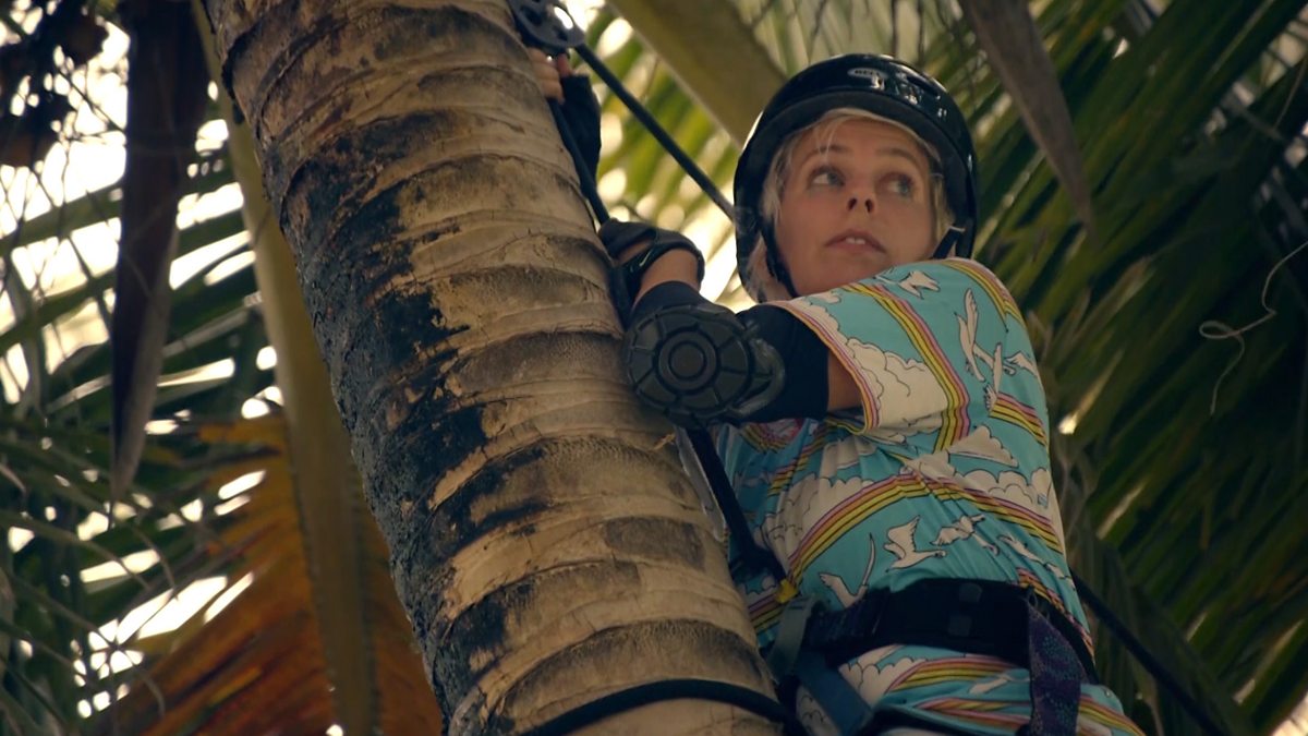In Cuba, Sara struggles up a coconut tree in an attempt to gather coconuts for a traditional Cuban sweet.