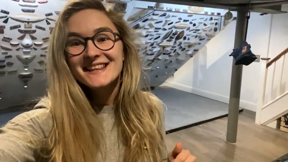 With sport facilities closed in the coronavirus lockdown, she's built her own climbing wall in her basement and has her dog Arthur standing in as a makeshift coach.