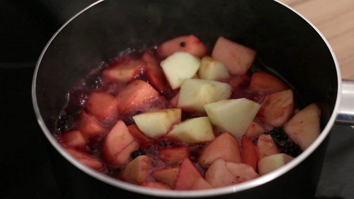 Uisdean prepares apple crumble.