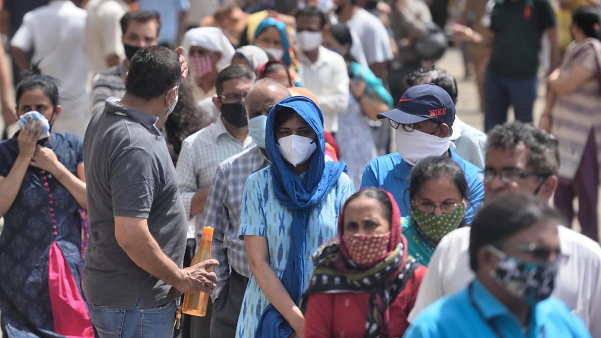 (Image: People wait in a queue to receive the Covid-19 vaccine at Dahisar Vaccination Centre in April 2021, Credit: Getty Images.)