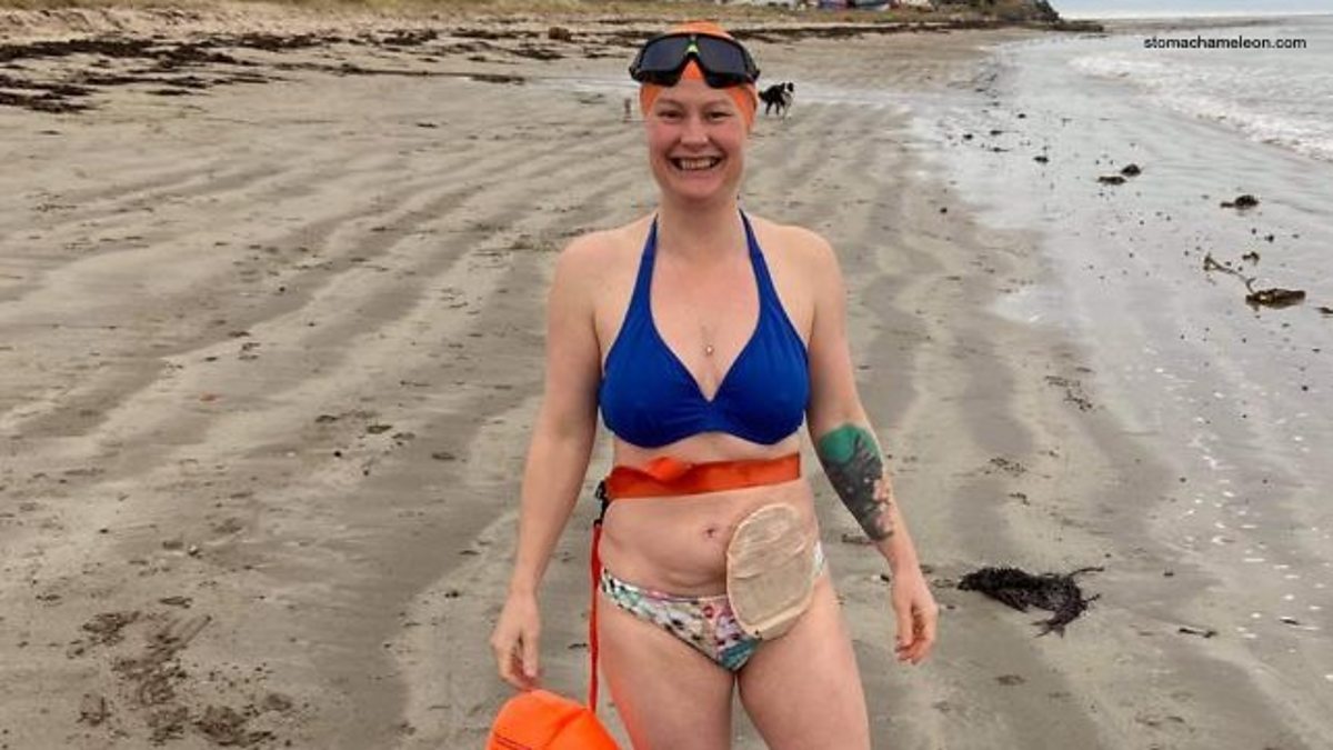 The sea off the coast of the north of England is not a place many people choose to swim in the middle of winter. But one woman has been swimming there throughout the last seven cold months, in just a bikini, to raise awareness about stomas and birth trauma. A stoma is a small opening in the stomach where human waste can be passed out through a tube into a colostomy bag if illness or injury means it can't come out in the normal fashion. People often hide the bags or find them embarrassing. But Gill Castle has decided to wear hers proudly in order to raise money for the Birth Trauma Association and to encourage other people with stomas to overcome the stigma, and grab life with both hands.