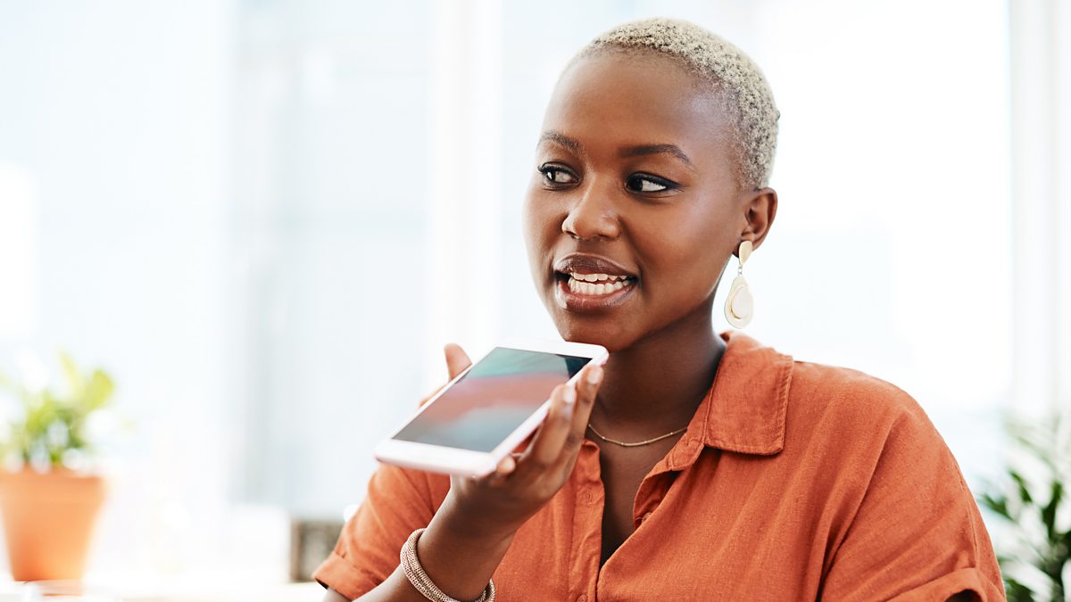 (Image: Woman speaks into smartphone, Credit: Getty Images / PeopleImages.)