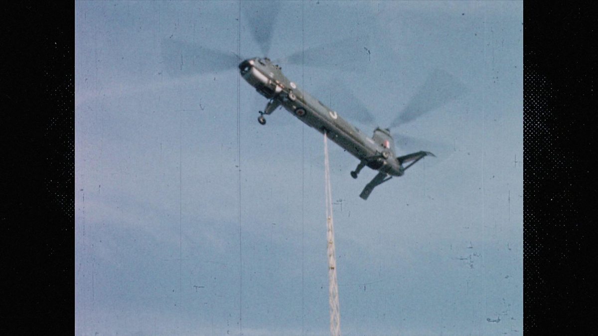 On 26 April 1962 a RAF Belvedere helicopter places the 25-metre open-work bronze spire on the roof of the new Coventry Cathedral.