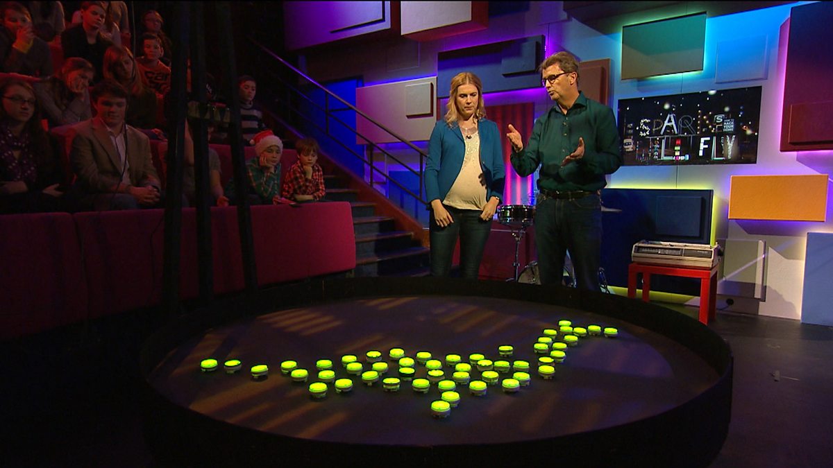 Paul Beardsley from Disney Research Zurich explains how the 50 pixelbot robots work together in a swarm to create animations. The camera mounted above the pixelbot arena monitors each pixelbot’s location, and sends this information into a computer. The computer software then works out where it needs each pixelbot to move in order to create the desired image, and sends out a wireless signal to each pixelbot, instructing it where to move. The pixelbots perform a collection of animations to demonstrate this, including a dinosaur and a human. Finally, a volunteer joins Paul Beardsley to scramble a few of the pixelbots and test their ability to rejoin the image. The software recognises the removal of the pixels and adjusts for it in the most efficient way, by instructing the remaining pixelbots to move into the gap created, while the separated pixelbots are instructed to move into the image from their new location. This group of pixelbots demonstrates how robots must work together in a swarm to achieve a common goal, and highlights the importance of adjusting efficiently in response to changes.