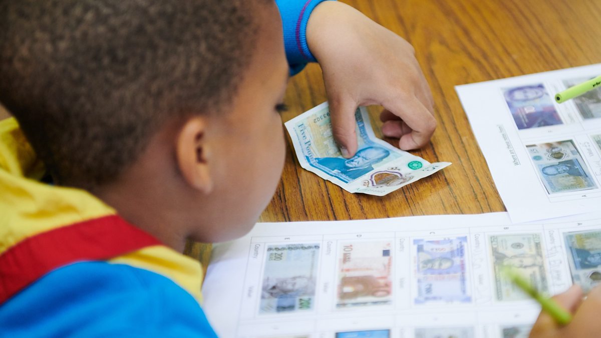 ( Photo: Beaver Scout looks at a five pound note. Credit: The Scouts Association