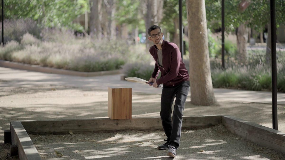 Sundar Pichar accepts Amol Rajan's challenge and plays a spot of cricket at the Google campus.