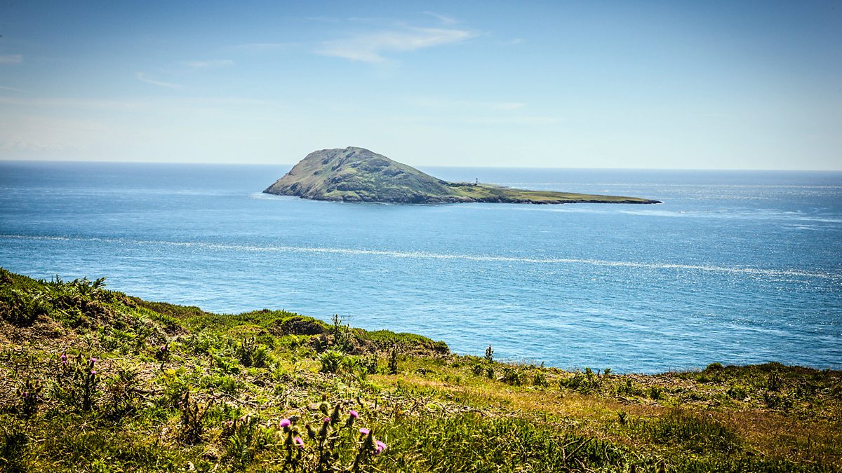 Colin Evans sy'n tywys ymwelwyr ar ei gwch i Ynys Enlli