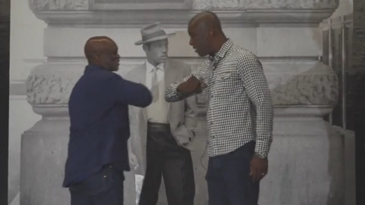 Tottenham Community activist Stafford Scott shows Eddie Nestor around his exhibition "War Inna Babylon" at the institute of Contemporary Arts in Central London