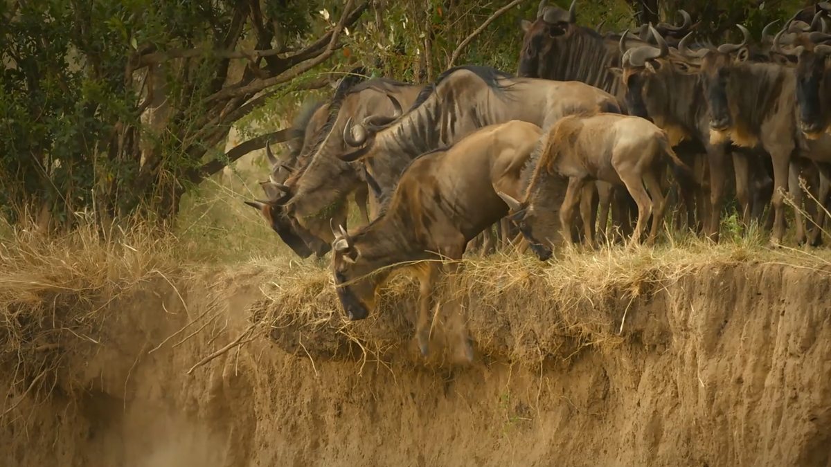 The wildebeest tackle a vertical drop too steep for Gnu. He has no choice but to make the jump if he's to reach the river crossing below.