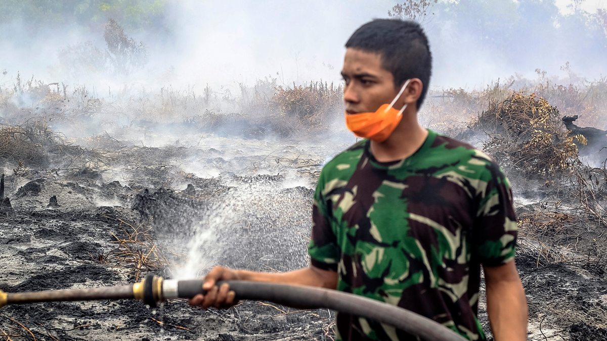 Photo: A member of the military dampens down a burning forest - fires are often started deliberately to make way for plantations such as palm oil. Credit: Getty Images