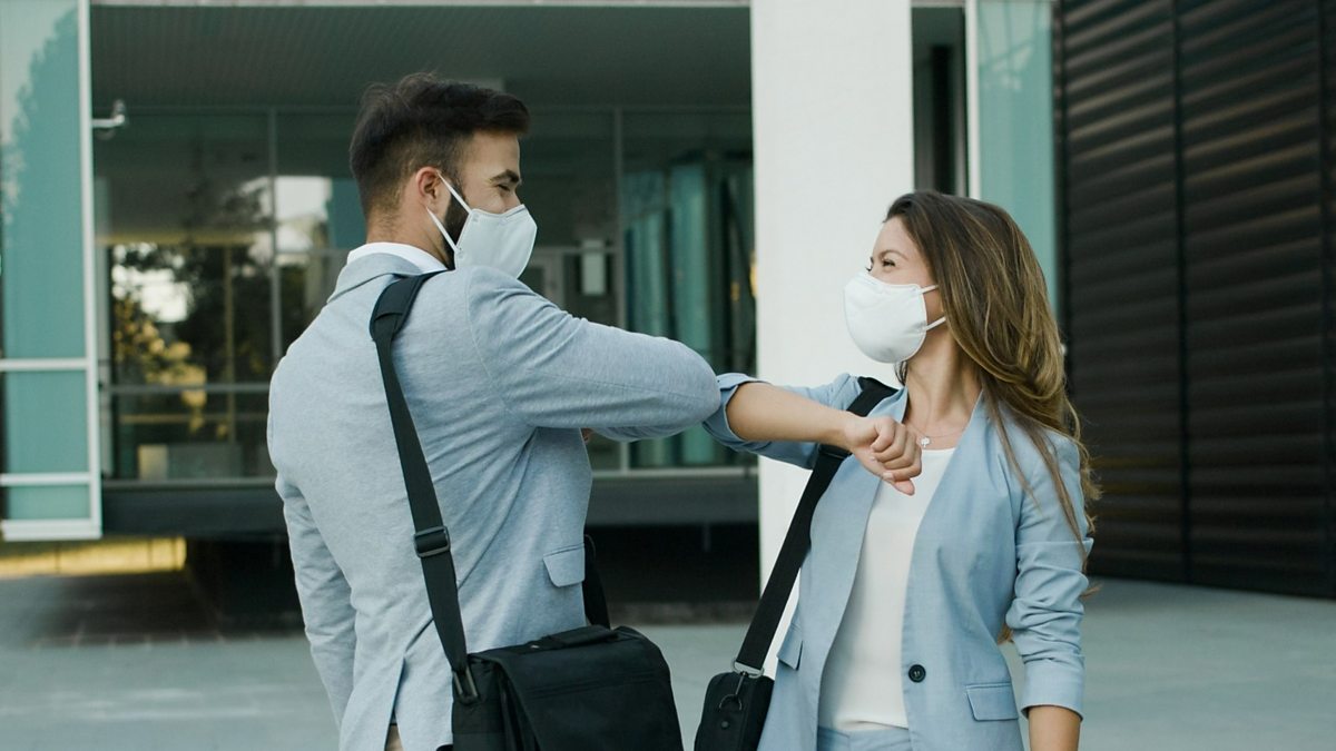 Photo: Business people bump elbows as greeting during COVID-19 pandemic