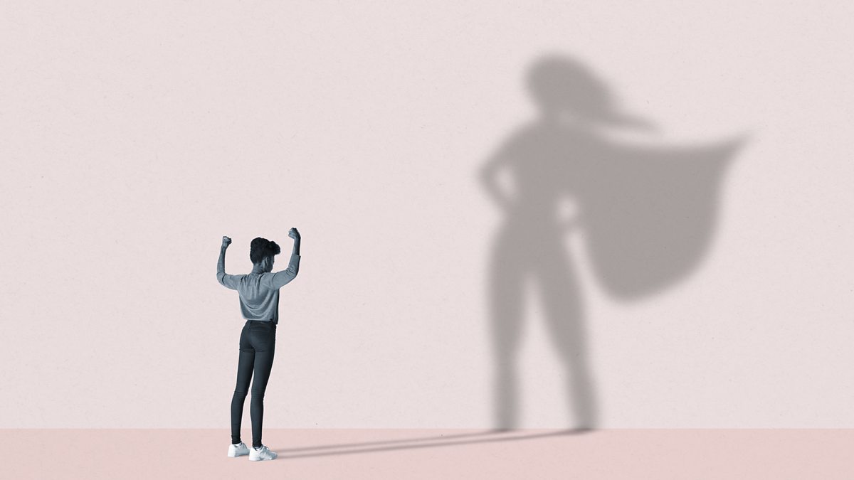 Photo: Young woman flexing muscles in front of large superhero shadow